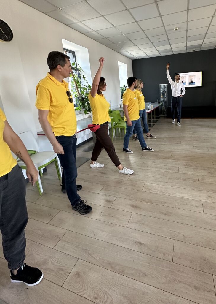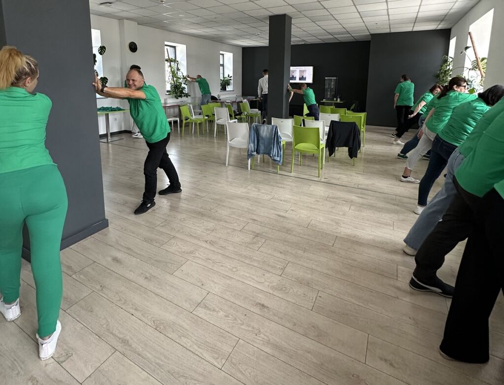 Jak widać na fotografiach, wszyscy pracownicy aktywnie uczestniczyli w gimnastyce, dzięki czemu mamy nadzieję, że ćwiczenia wejdą na stałe do ich codziennej rutyny biurowej.